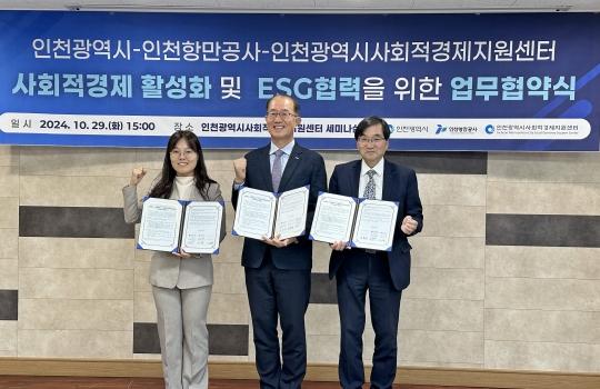 인천항만공사는 29일 인천광역시사회적경제지원센터(인천광역시 미추홀구 석정로 229)에서 인천광역시, 인천광역시사회적경제지원센터와 ‘사회적경제 활성화 및 ESG협력을 위한 업무협약’을 체결했다고 밝혔다.