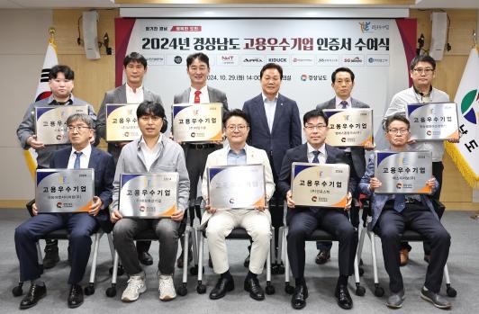 박완수 경남도지사는 29일 고용 창출과 근로환경 개선을 통해 일자리 안정화에 기여한 도내 10개 기업에 '2024년 경상남도 고용우수기업 인증서‘를 수여하고 격려했다.