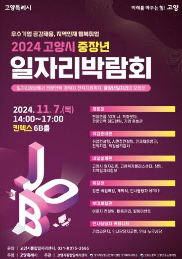 고양특례시는 기업과 구직자의 효율적인 매칭을 위해 오는 11월7일 킨텍스 6홀에서 ‘2024 고양시 중장년 일자리박람회'를 개최한다고 밝혔다.