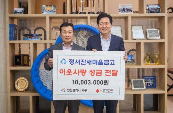 인천 서구는 10월 29일, 정서진새마을금고로부터 이웃돕기 성금 1,000만 3천원을 전달받았다.