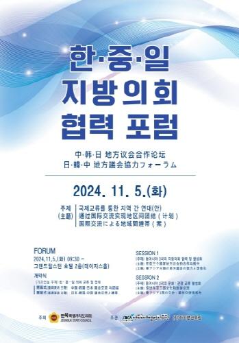 전북특별자치도의회가 주최하고 전북국제협력진흥원이 주관하는 ‘한·중·일 지방의회 협력 포럼’이 오는 11월 5일 전주 그랜드힐스턴 호텔에서 개최된다.