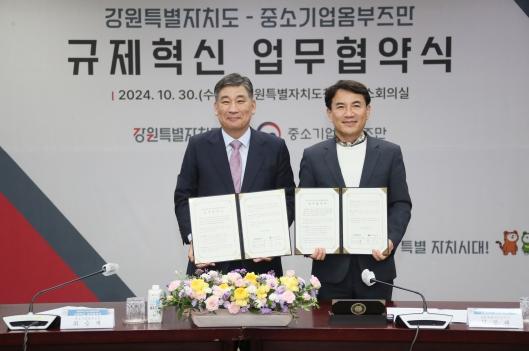 강원특별자치도와 중소기업 옴부즈만은 10월 30일 오전 11시 강원자치도청 신관 소회의실에서 지속가능한 중소기업 규제혁신을 추진하기 위한 상호 업무협약을 체결했다.