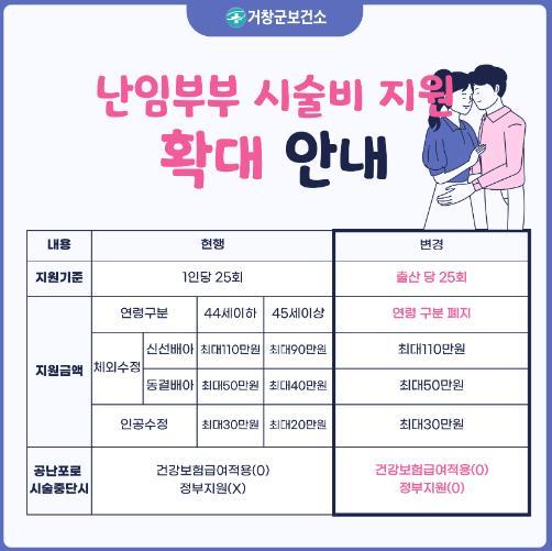 난임부부 시술비 지원 신청을 희망하는 주민은 거창군보건소 모자보건실로 문의하면 된다.