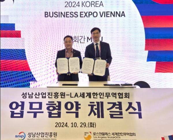 성남산업진흥원은 지난 10월 29일(한국시간 10월 30일) LA 세계한인무역협회와 성남 중소벤처기업의 글로벌 경쟁력 강화를 위한 업무협약을 체결했다.