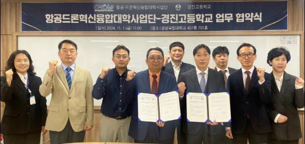 경상국립대학교(GNU·총장 권진회) 항공드론혁신융합대학사업단(CArDio, 단장 박재현 교수)과 진주 경진고등학교(교장 황일환)는 11월 1일 가좌캠퍼스에서 ‘첨단분야(항공·드론) 활성화 및 상호 긴밀한 협력체제 구축’을 위해 업무협약을 체결했다.
