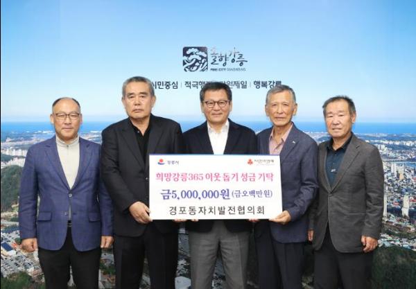 (사)경포동자치발전협의회는 강릉 지역사회를 위한 연계 모금 활동인 ‘희망강릉365’에 성금 500만원을 기탁하며, 지역사회 발전과 나눔 활동에 적극 동참하고 있다.