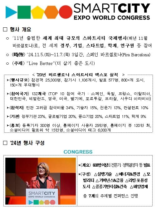 '스마트시티 엑스포 월드 콩그레스(SCEWC)'는 2011년부터 바르셀로나에서 개최된 도시 혁신을 위한 세계 최대 규모이자 가장 영향력 있는 국제행사로, 세계 여러 도시와 세계적(글로벌) 기업의 스마트시티 기술을 한눈에 참관할 수 있어 큰 인기를 얻고 있다.
