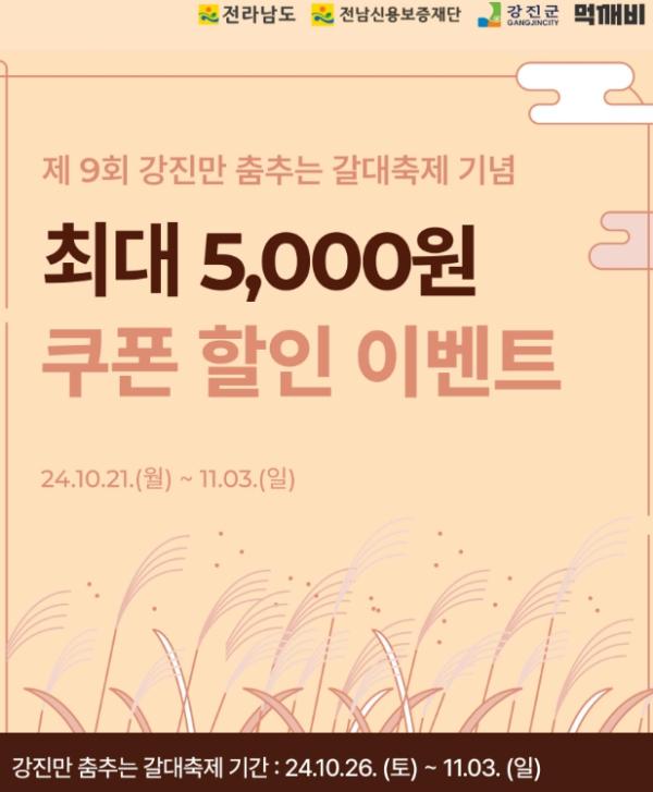 이번 공공배달앱 먹깨비 할인 이벤트는 갈대 축제 기간인 10월 26일 토요일부터 11월 3일 일요일까지는 최대 5천 원, 그 외 기간 10월 21일 월요일부터 10월 25일 금요일까지는 매일 3천 원 할인 쿠폰을 지급했다.