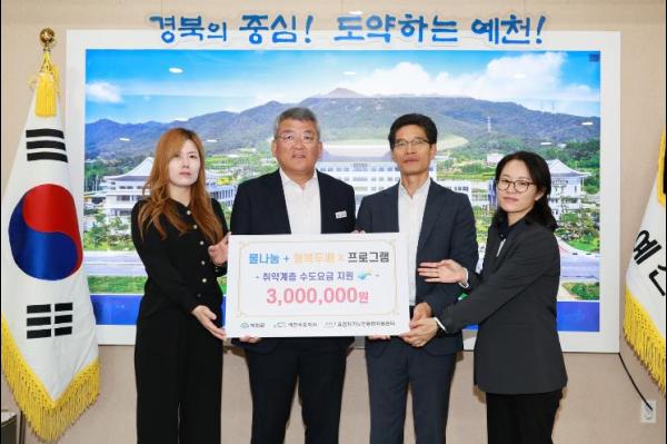 K-water 예천수도지사는 6일 예천군청 군수실에서 관내 취약계층 독거노인 70가구와 복지사각지대 15가구를 대상으로 매달 50만 원씩 총 300만 원의 상수도 요금을 지원하는 ‘물나눔×행복두배 프로그램’ 기부금 전달식을 가졌다.