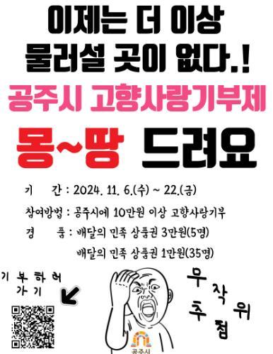 공주시는 연말을 맞아 적극적인 고향사랑기부 모금을 위해 고향사랑기부제 ‘이제는 더 이상 물러설 곳이 없다!’ 이벤트를 진행한다고 6일 밝혔다.
