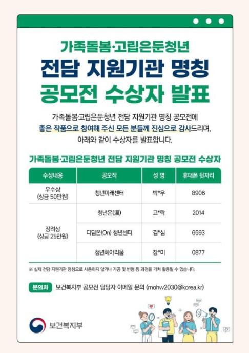 보건복지부는 8월 27일부터 두달에 걸쳐 진행된 '가족돌봄·고립은둔청년 전담 지원기관 명칭 공모' 결과, ‘청년미래센터’가 최종 선정됐다고 밝혔다.