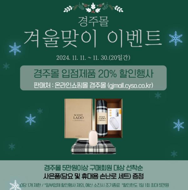 지역 농특산물 온라인 쇼핑몰인 경주몰이 겨울을 맞아 입점 제품 20% 할인 이벤트를 진행한다고 6일 밝혔다.