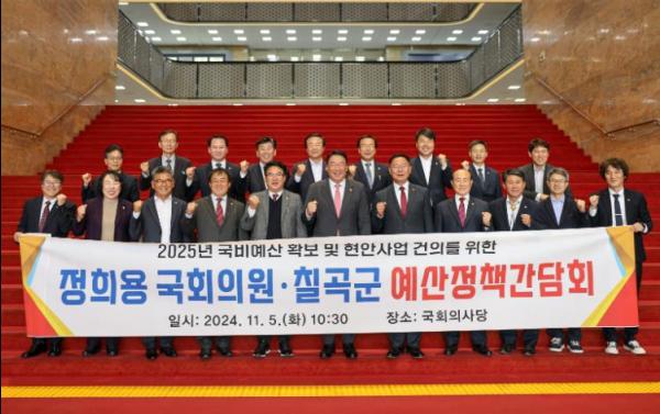 김 군수는 이상승 칠곡군의회의장, 박순범, 정한석 경상북도의원 등 30여 명과 함께 정희용 국회의원과 간담회를 개최하여 지역 현안사업의 추진을 위해 국비가 내년 정부예산에 반영될 수 있도록 적극적인 협력을 요청했다.