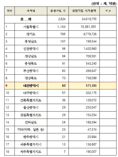 이는 6대 광역시 가운데 인천(94개), 부산(82개)에 이어 세 번째로 높은 수준이며 지역 시가총액 기준으로는 57조 원으로 6대 광역시 중 인천에 이어 두 번째, 비수도권 광역시 가운데 1위에 해당한다.