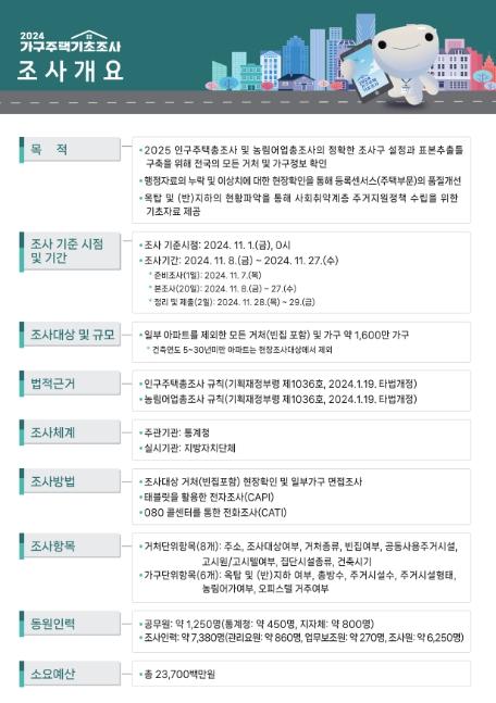 '2024 가구주택기초조사'는 통계청이 주관하고 지방자치단체를 통해 전국적으로 실시되는 조사로 공무원 1천 3백명과 조사요원 8천여명이 참여하여 가구의 주소, 거처종류, 빈집여부, 집단시설종류, 옥탑 및 반지하여부, 총방수, 주거시설수 및 형태 등 14개의 항목을 조사할 예정이다.