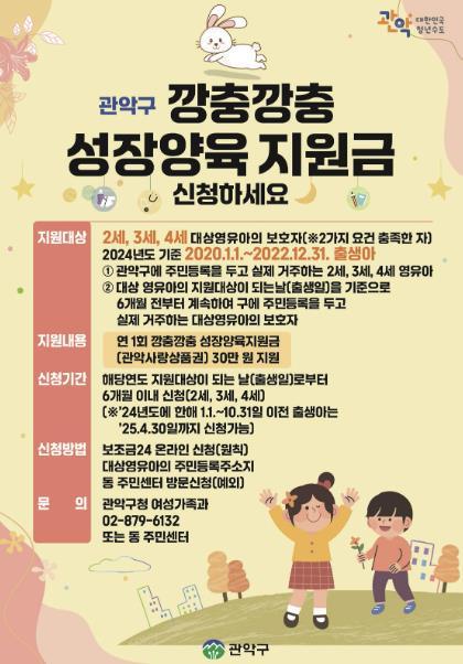 구는 저출산 시대에 현실성 있는 정책을 추진하고자 올해 4월 「서울특별시 관악구 깡충깡충 성장양육지원금 지원 조례」를 제정하고, 추가경정예산 총 10억 원을 확보했다.