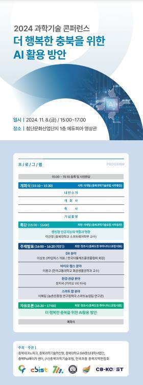 충북 디지털 위크 기간 중 열린 이번 행사는 (사)충북과학기술포럼, 한국과총 충북지역연합회, 충북Pro메이커센터, 충북대 SW중심대학사업단, 충북TP, 충북과기원이 공동 주관했으며, 지역혁신기관, 대학, 기업 등 다양한 분야 관계자들이 참석하여 AI 기술을 통한 충북의 발전과 행복 증진을 위한 방안을 논의했다.