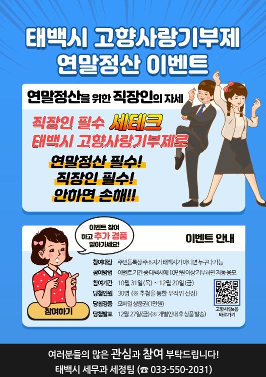 태백시는 10월 31일부터 12월 20일까지 고향사랑기부제 활성화를 위해 특별한 연말정산 이벤트를 실시한다.