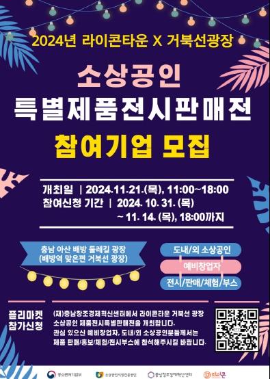 2024년 (충남)신사업창업사관학교 사업을 운영하는 충남창조경제혁신센터에서는 오는 11월 21일 창업을 꿈꾸는 예비창업자를 대상으로 다양한 질 높은 창업 교육을 지원해주는 사업의 일환으로 예비창업자, 창업기업 및 도내/외 소상공인들의 판로개척을 위해 아산 배방 둘레길 광장에서 소상공인 특별제품전시판매전을 개최한다고 한다고 밝혔다.