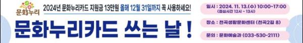 동해시는 11월 13일 오전 10시부터 오후 5시까지 천곡 생활문화센터에서 ‘문화누리카드 찾아가는 홍보부스’를 운영한다고 밝혔다.