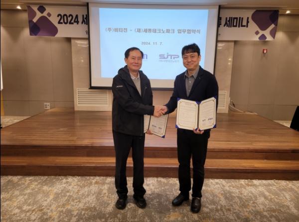 (재)세종테크노파크(원장 양현봉)는 지난 8일 바이오메디컬활성소재센터 건강기능식품GMP 시설 이용을 위한 장기활용기업 선정에 따라 ㈜비티진과 업무협약을 체결하고 세종시 건강기능식품 및 식품산업 육성과 공동협력 등을 위해 함께 노력할 것을 협약했다.