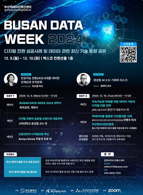 이번 '부산 데이터 위크 2024'는 데이터 산업 및 디지털 전환 관계자, 데이터에 관심 있는 누구나 참여할 수 있으며, 참가를 위한 사전등록은 '부산 데이터 위크' 누리집을 통해서 하면 된다.