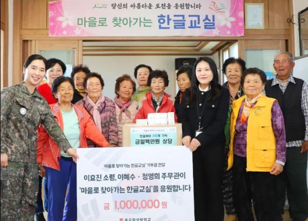 지난 11일, 육군화생방학교 이효진 소령(화생방학 교관), 이혜수 주무관(전문군무경력관 다군), 상무대근무지원단 정영희 주무관(8급)이 장성군의 ’마을로 찾아가는 한글교실‘에 상금을 기부해 지역 사회에 훈훈한 감동을 전했다.