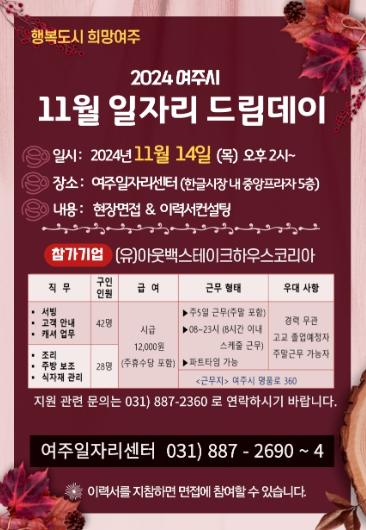 여주시는 11월 14일 오후 2시 여주일자리센터에서 ‘2024년 11월 일자리드림데이’ 채용행사를 개최한다.