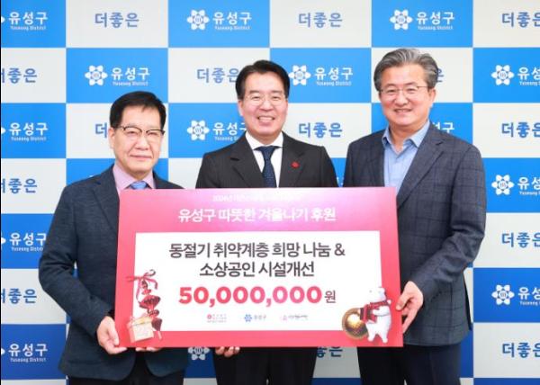 대전 유성구는 12일 구청 행복사랑방에서 대전신세계Art·Science가 유성구 취약계층 지원을 위한 후원금 5천만 원을 유성구 행복누리재단을 통해 기탁했다고 밝혔다.