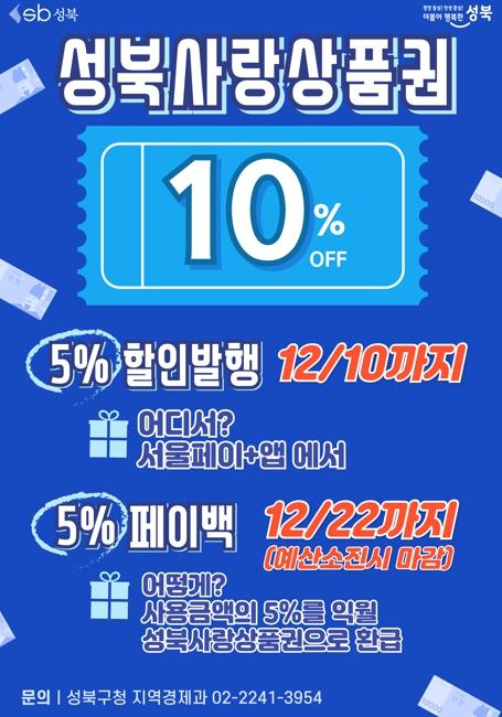 5%의 할인율과 5%의 페이백 이벤트로 10%의 할인효과를 누릴 수 있는 성북사랑상품권은 1인당 최대 월 50만 원까지 구매할 수 있으며 보유 한도는 150만 원이다. 성북구 내 성북사랑상품권 가맹점에서 사용할 수 있다. 발행된 상품권은 오는 12월 10일까지 구매할 수 있으며, 25년에는 설 맞이 상품권을 발행할 예정이다.