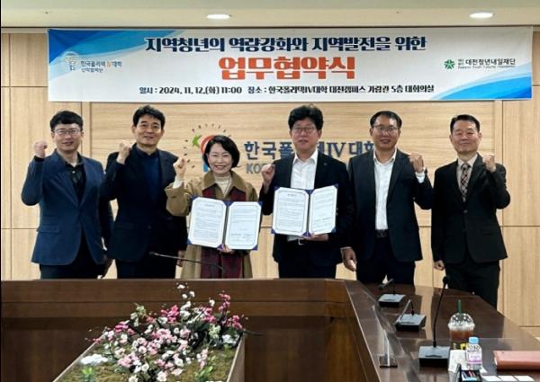대전청년내일재단과 한국폴리텍IV대학 산학협력단은 12일 한국폴리텍IV대학 가람관 대회의실에서 지역청년 지원을 위한 상호 협력의 필요성을 인식하고 업무협약을 체결했다.