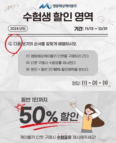 전남지역 대표적인 가족여행지인 명량해상케이블카에서 오는 11월 15일부터 2025학년도 대학수학능력시험을 마친 수험생들 및 그 가족들을 대상으로 그동안 수험공부를 지친 몸과 마음을 위로하고자 수험생들에게 반값 수능할인 이벤트를 진행한다고 밝혔다.