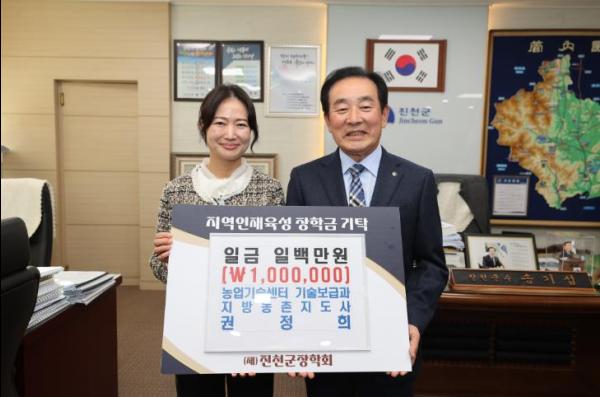 진천군 농업기술 발전을 위해 헌신해온 권정희 진천군 농업기술센터 농촌지도사가 13일 (재)진천군장학회에 지역 인재 육성을 위한 장학금 100만 원을 전달했다.