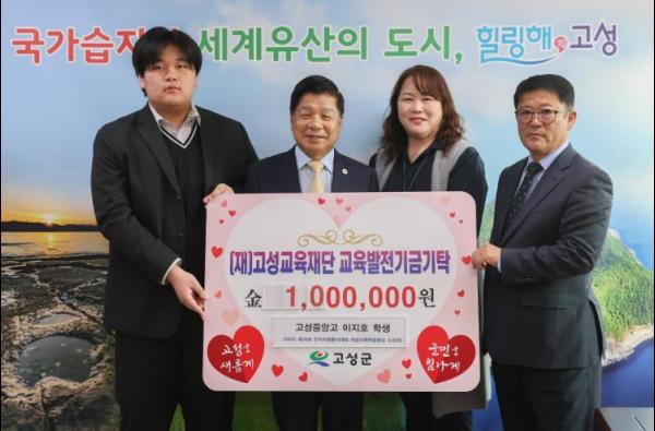 13일 고성중앙고등학교 1학년 이지호 학생이 고성군청을 방문해 교육발전기금 1백만 원을 기탁했다.