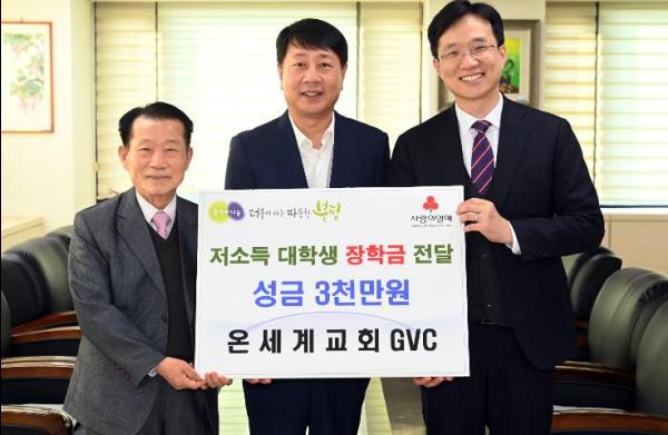 부평구는 지난 13일 온세계교회로부터 저소득 가정 대학생 장학금 3천만원을 전달받았다.