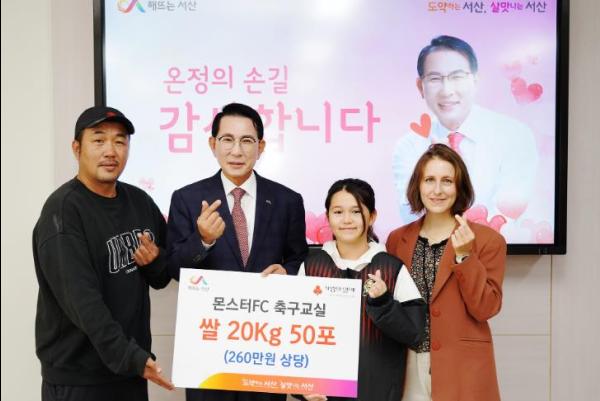 충남 서산시는 14일 몬스터FC 축구센터가 어려운을 이웃을 위한 사랑의 쌀 1톤을 기탁했다고 밝혔다.