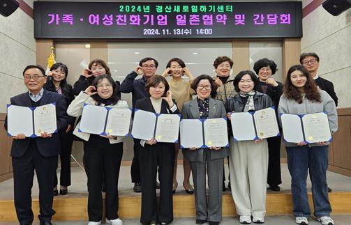 경산시가 운영하는 경산여성새로일하기센터는 13일 시청 별관 회의실에서 ‘가족·여성친화기업 일촌 협약식 및 간담회’를 개최했다.