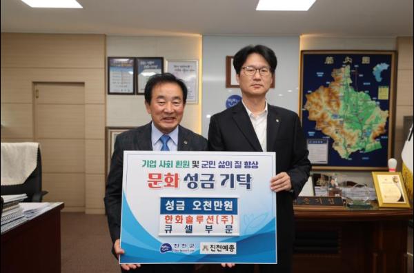 진천군은 한화솔루션(주) 큐셀부문가 진천군청을 방문해 문화 성금 5천만 원을 전달했다고 15일 밝혔다.