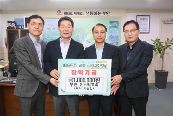 부안 온누리교회에서 지난 14일 부안군 근농인재육성재단을 방문하여 장학금 100만원을 기탁했다.