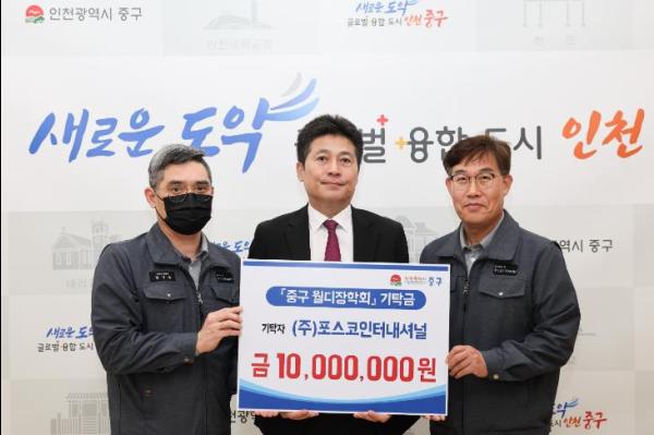 먼저 매년 지속적인 장학금 기부로 중구 인재 발굴에 앞장서며 지역사회의 본보기가 되어온 ㈜포스코인터내셔널은 1,000만 원의 장학금을 기탁했다.