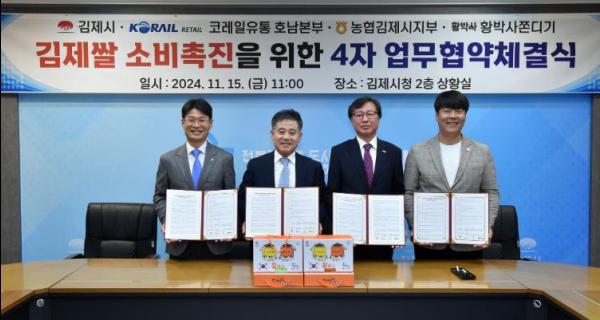 김제시는 15일, 코레일유통 호남본부, 농협김제시지부, 황박사쫀디기와 김제쌀 소비촉진과 판매 활성화를 위한 업무협약을 체결했다고 밝혔다.