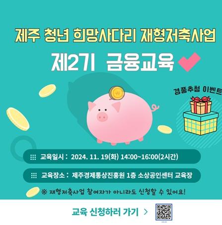 금융교육은 오는 11월 18일까지 선착순으로 모집하며, 참여를 원하는 근로자는 제주 청년 희망사다리 재형저축 누리집에서 회원가입 후 교육신청 게시판을 통해 신청하면 된다.