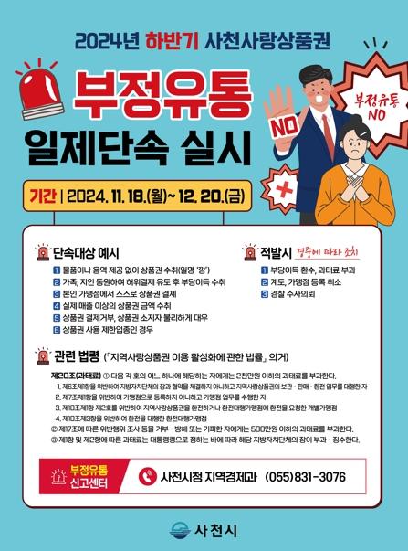 사천시는 사천사랑상품권의 건전한 유통질서 확립을 위해 부정유통 일제단속을 11월 18일부터 12월 20일까지 실시한다.