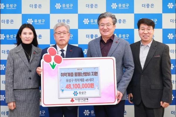 대전 유성구는 18일 대전사회복지공동모금회로부터 저소득층 가구의 따뜻한 겨울나기를 위한 후원금 4,810만원을 전달받았다고 밝혔다.