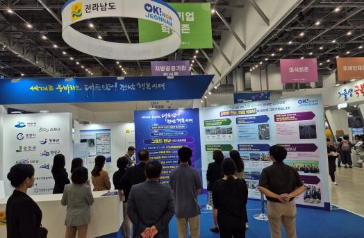 전남도는 ‘일자리 대도약! 도민이 행복한 일자리 창출’이란 주제로 민선 8기 후반기 비전과 정체성을 담은 전남 브랜드(BI) ‘오케이 나우 전남(OK, Now Jeonnam)’과 미래세대에 물려줄 새로운 청사진 ‘그랜드 전남 10대 프로젝트’ 핵심 내용을 전시했다.