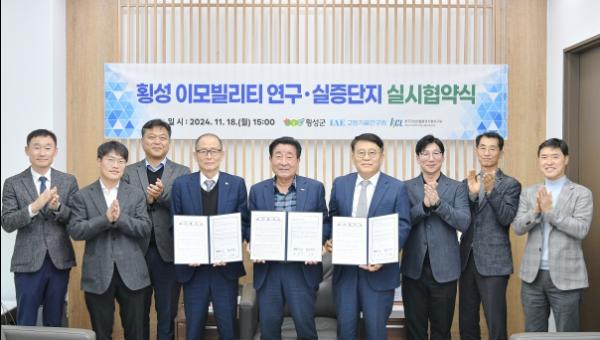 횡성군과 고등기술연구원(원장 김진균), 한국건설생활환경시험연구원은 18일 15시 횡성군청에서 모빌리티 연구·실증단지 조성 실시협약을 맺었다.
