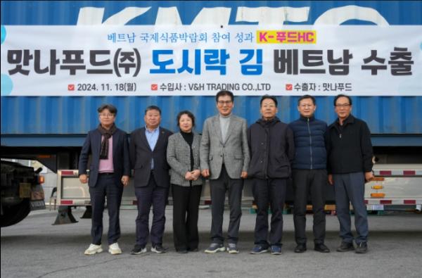 전남 함평군이 18일 동함평산단에 위치한 맛나푸드(대표 노미숙)에서 베트남으로의 김 수출을 기념하는 선적식을 개최했다.