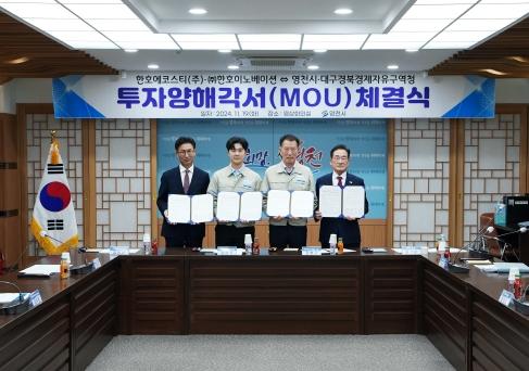 영천시는 19일 시청 영상회의실에서 영천시와 한호에코스티㈜, ㈜한호이노베이션, 대구경북경제자유구역청이 영천시 영천첨단부품소재산업지구 내 자동차부품 생산공장 건립을 위한 투자유치 MOU를 체결했다고 밝혔다.