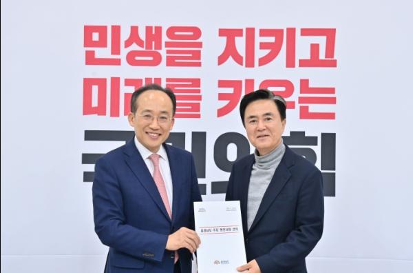 이어 김 지사는 엄태영 예결 소위 의원과 추경호 국민의힘 원내대표를 차례로 만나 국립치의학연구원 천안 설립, 아산경찰병원 건립 등 앞서 기재부에 정부 예산 반영을 요청한 도정 주요 현안을 설명한 뒤 당 차원의 적극적인 지원과 협조를 건의했다.