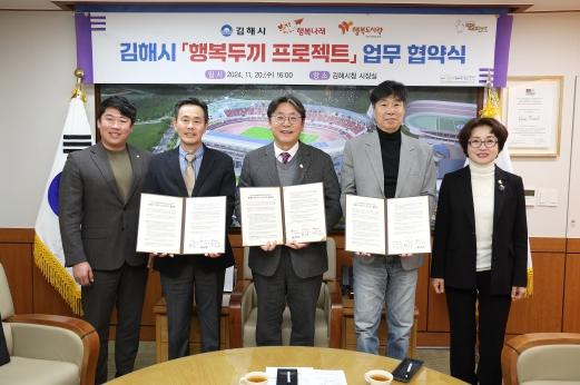 김해시와 행복나래(주), 행복도시락 사회적협동조합은 20일 김해시청에서 홍태용 시장과 행복나래(주) 조민영 본부장, 행복도시락 최준 사무국장, 김유상 시의원 등 10여명이 참석한 가운데 ‘김해시 행복두끼’ 협약을 체결했다.